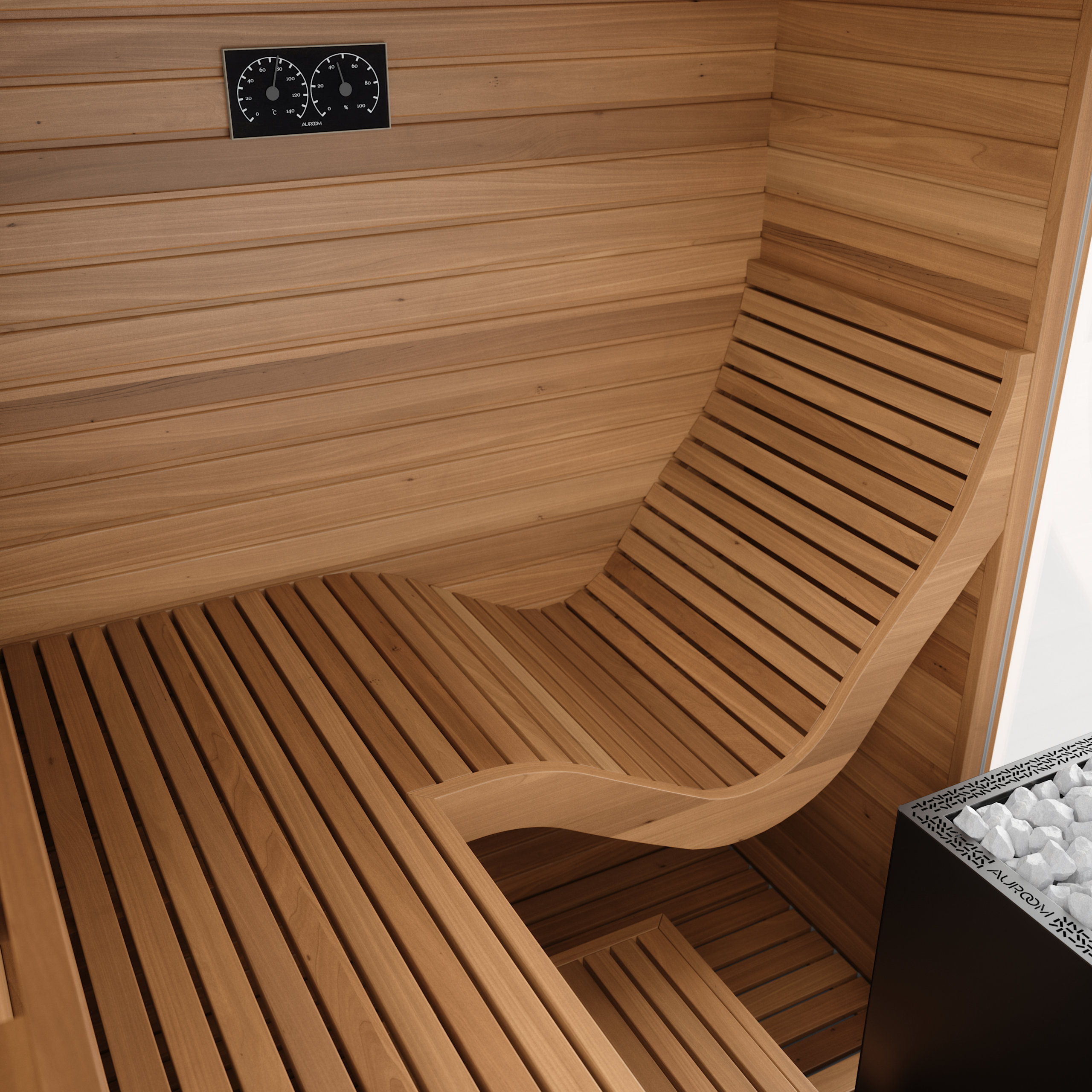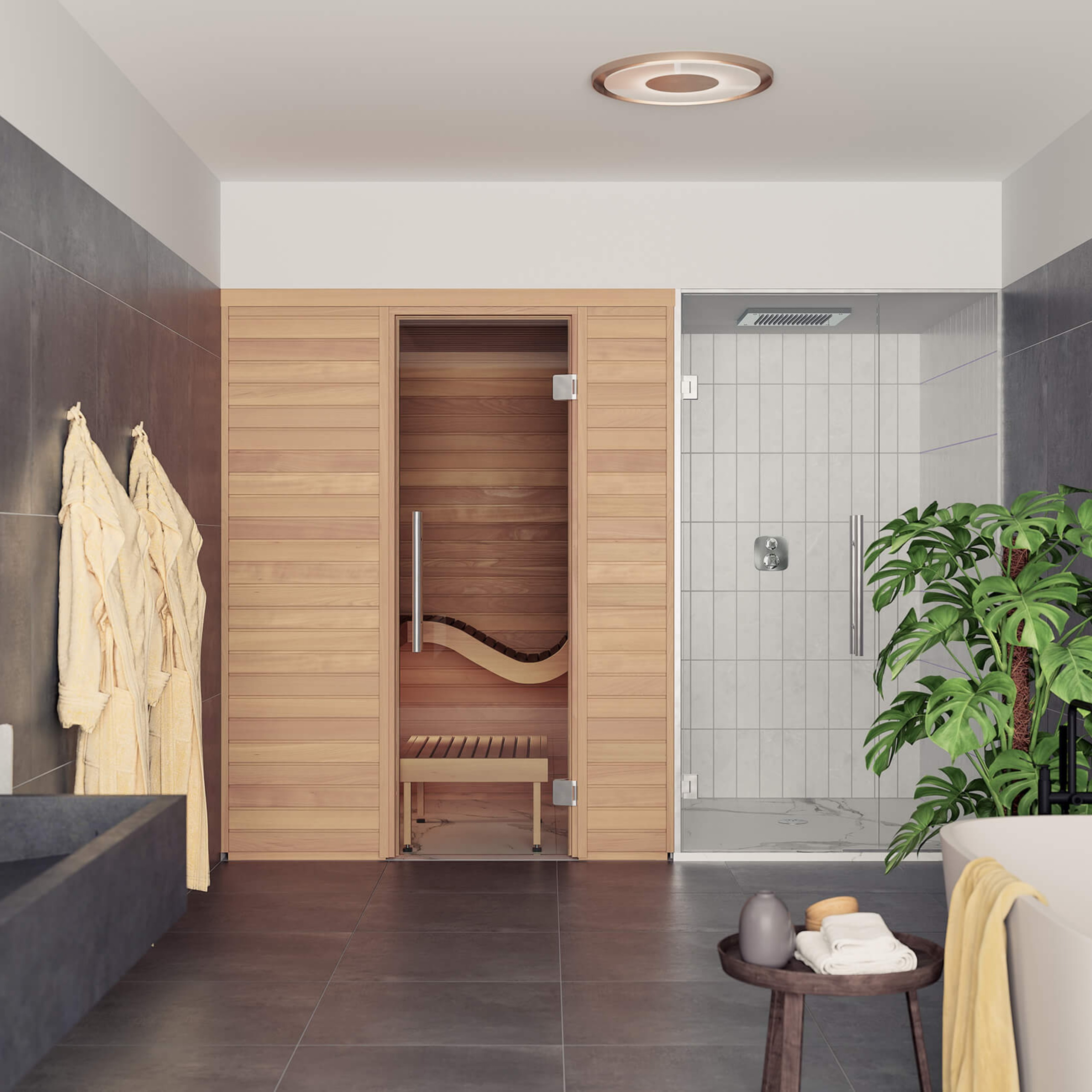 A compact sauna with curved seating for superior comfort in small spaces. Available in Glass, Glass Corner, and Wood designs, Baia balances efficiency, craftsmanship, and style.
