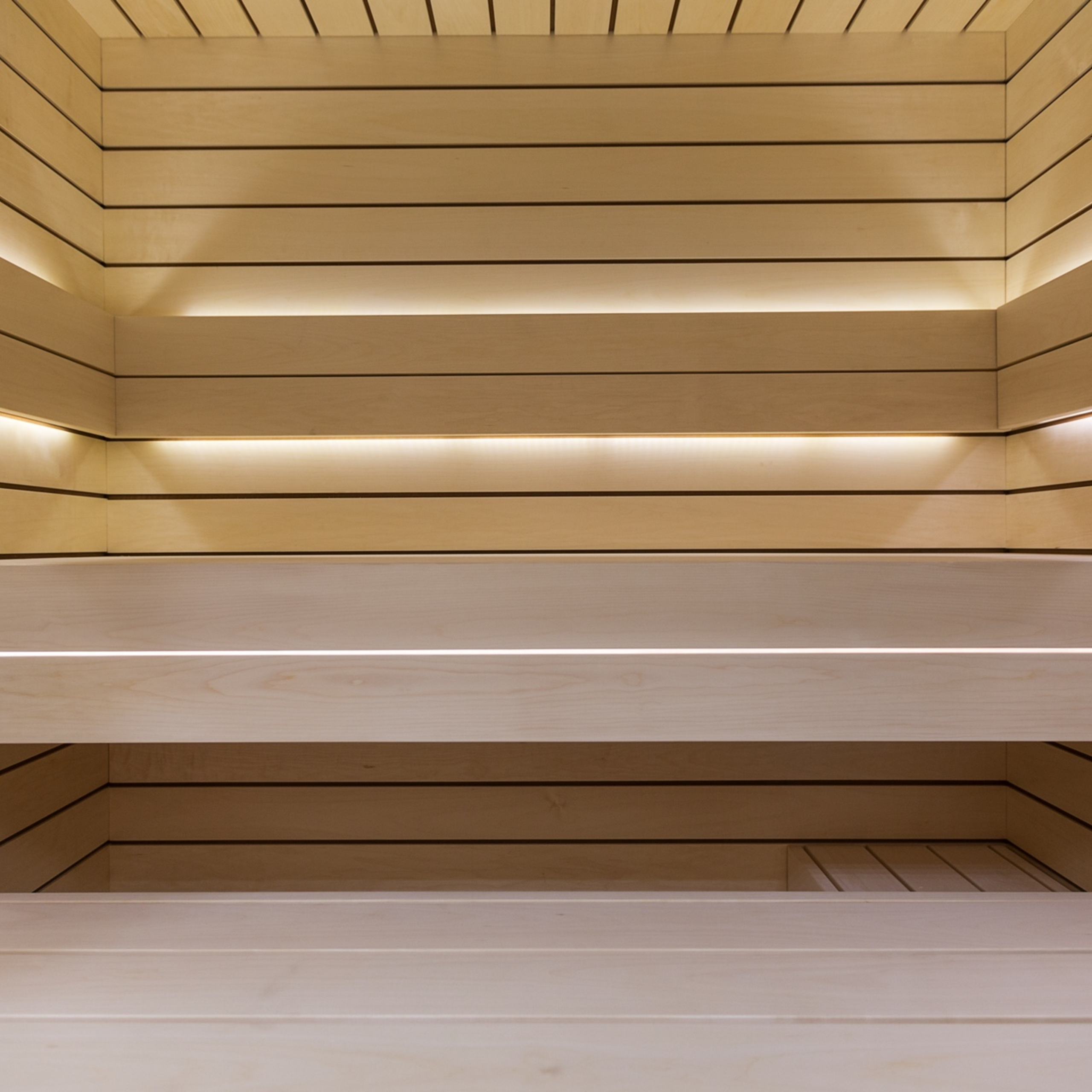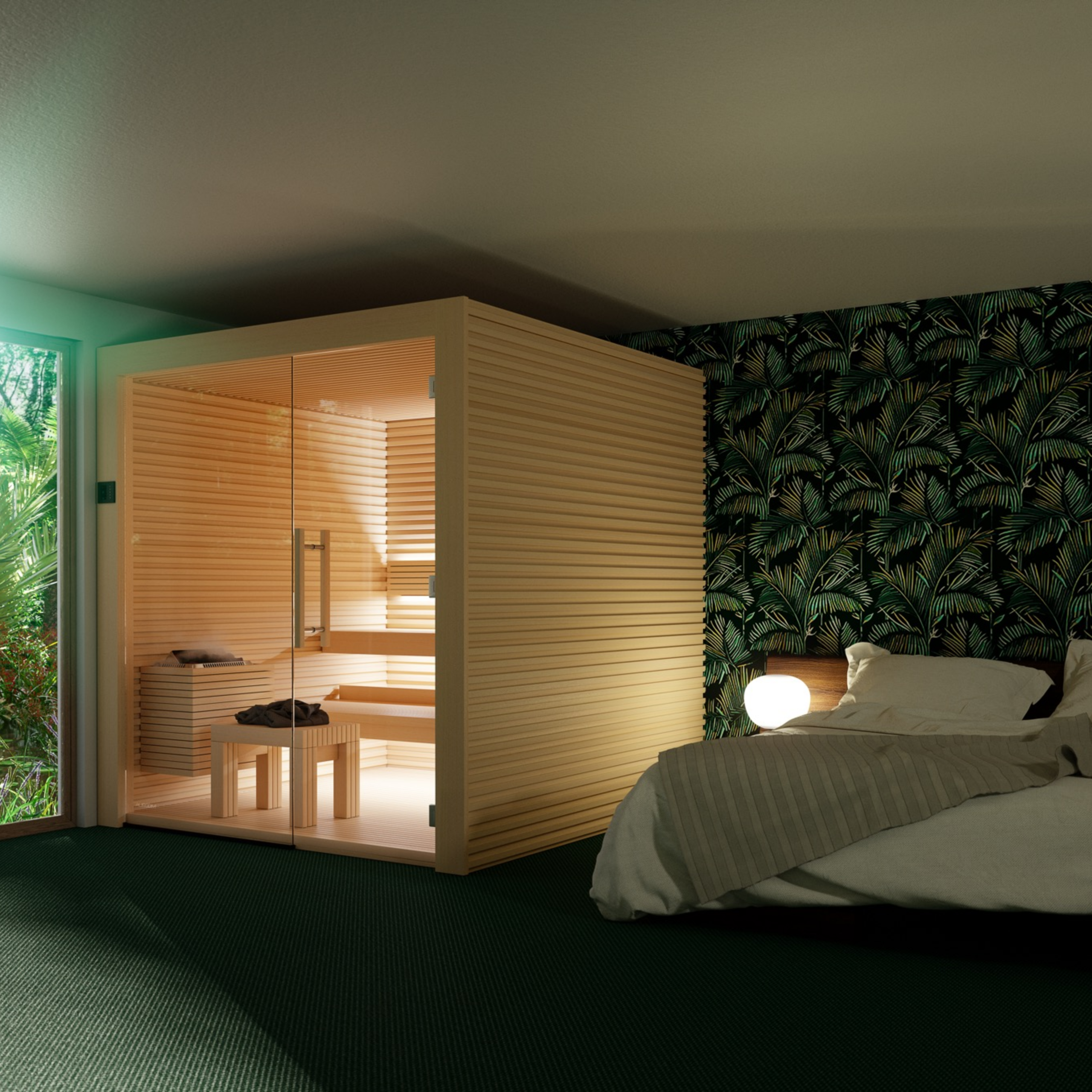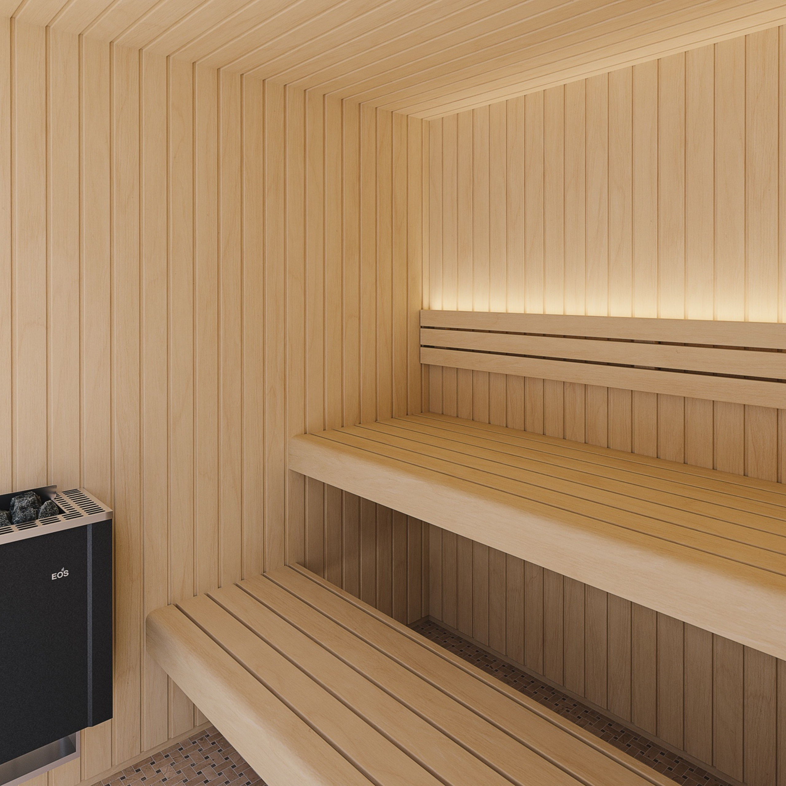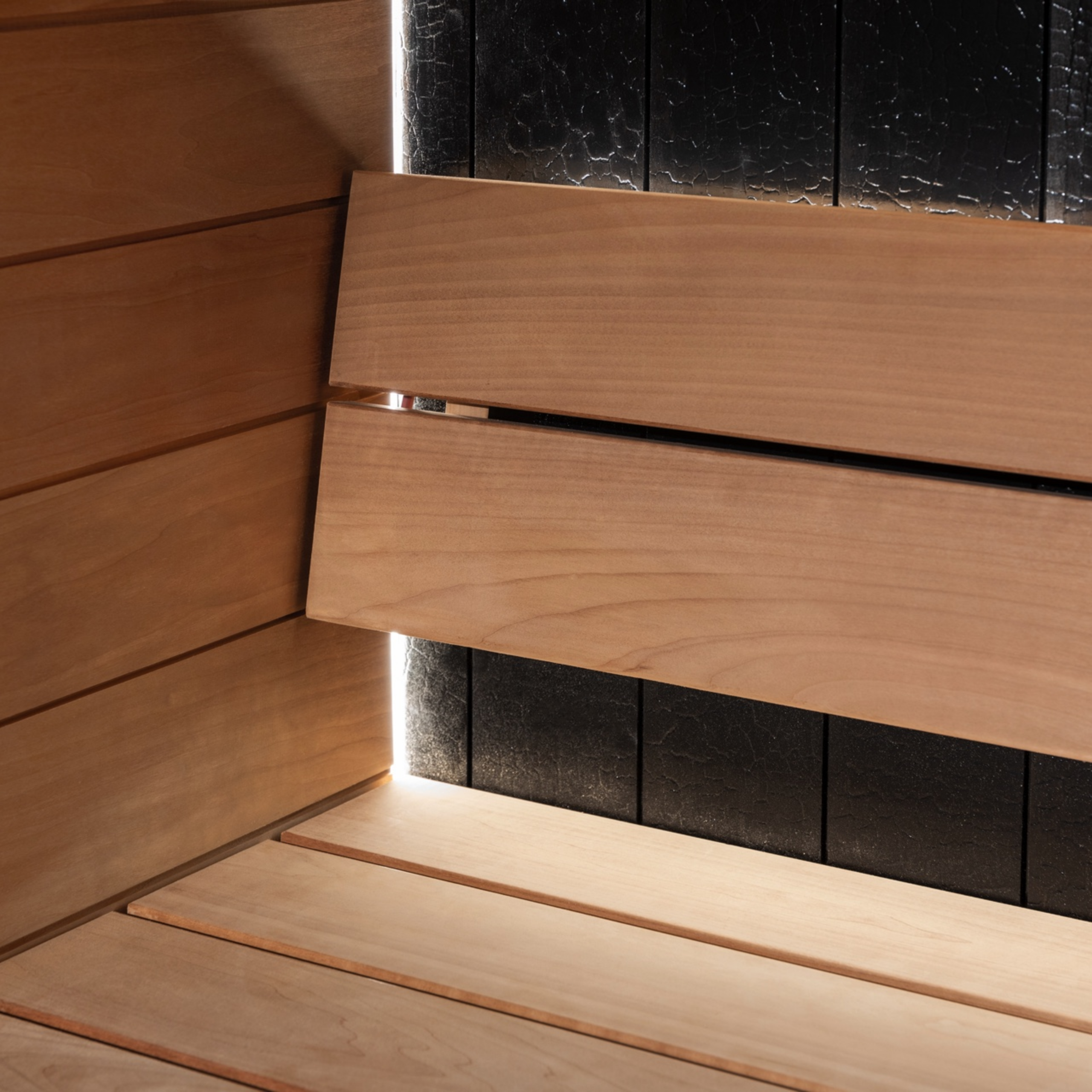 The Lumina combines refined bi-colour walls with a warm, harmonious interior. Thoughtful details and soft lighting create a tranquil atmosphere for a fully restorative sauna experience.