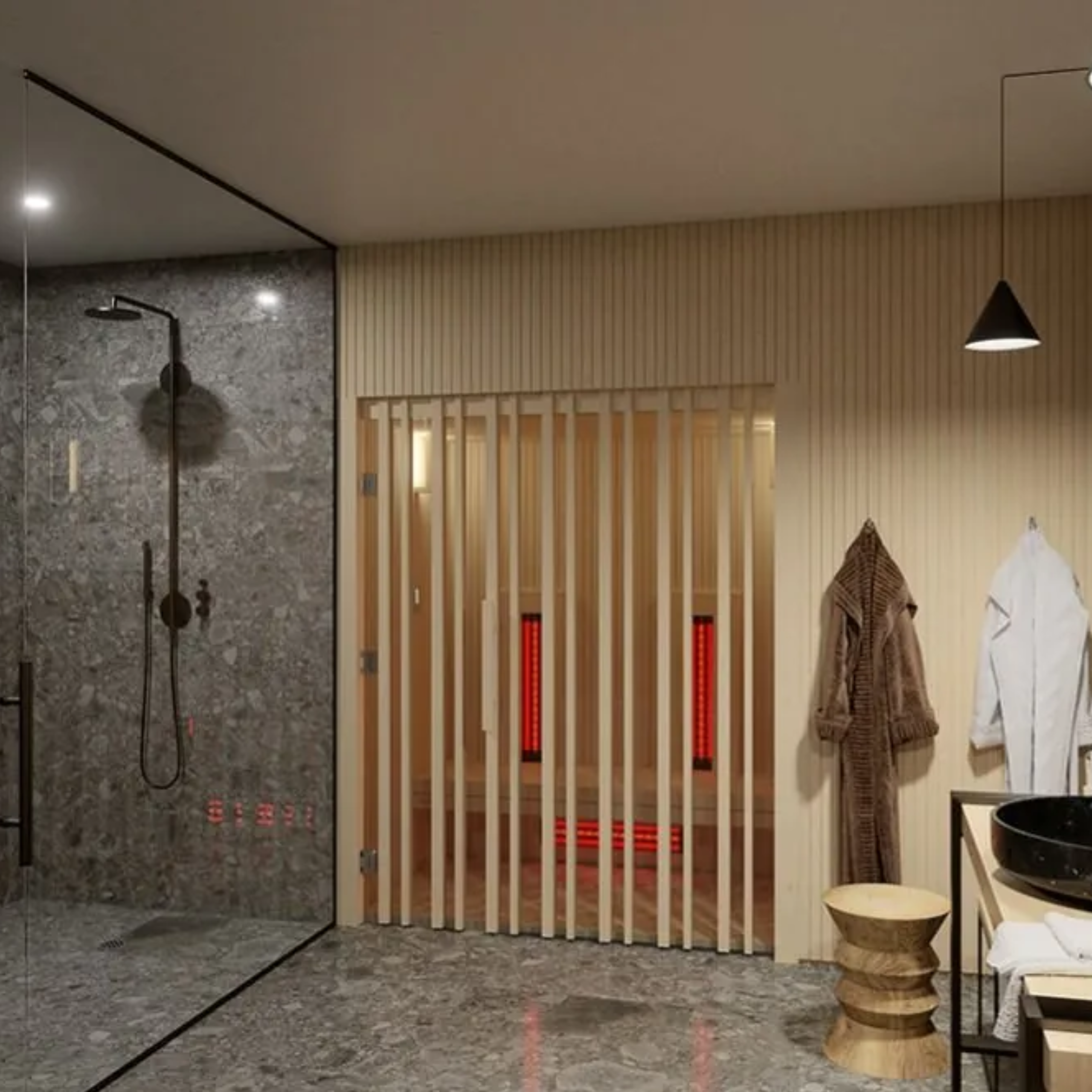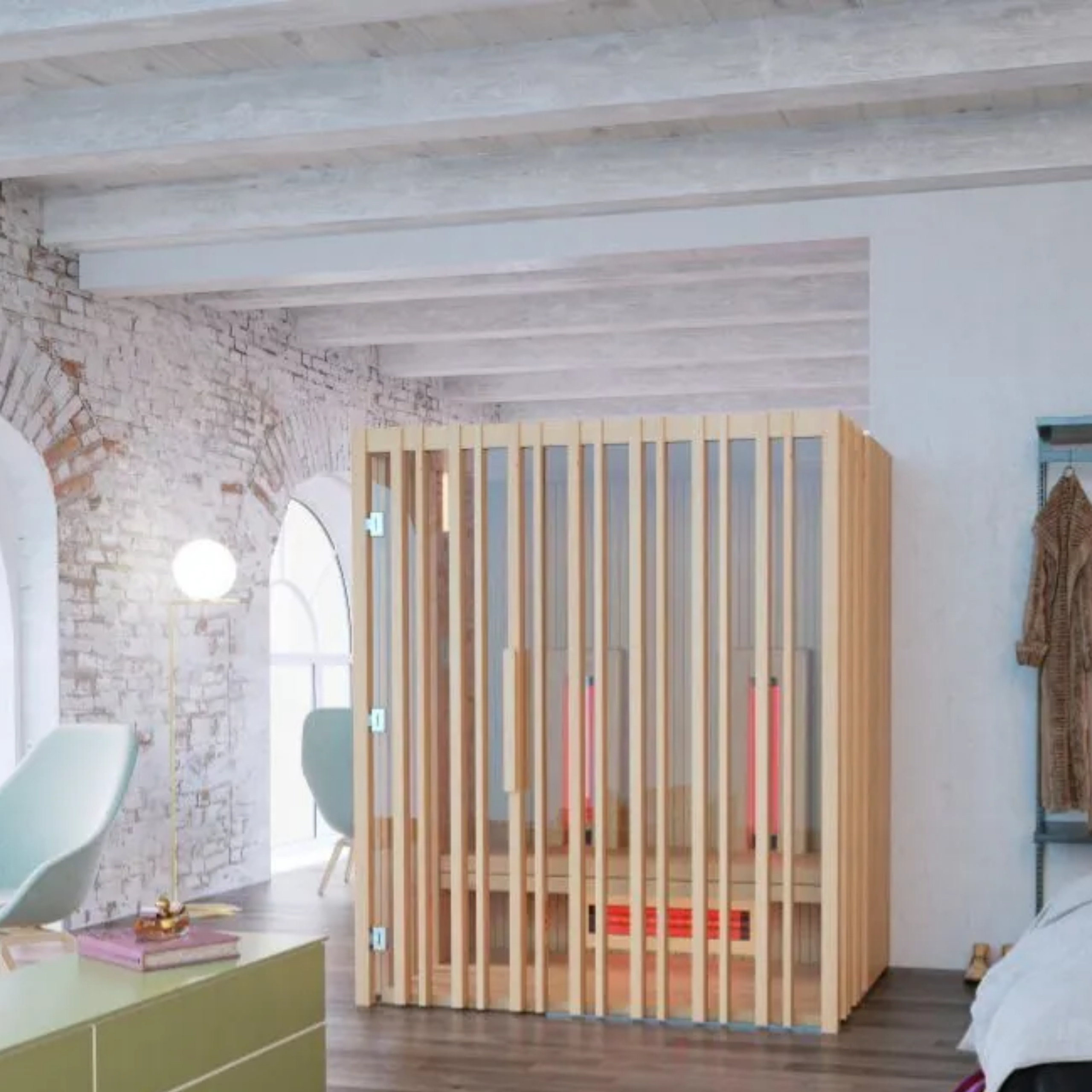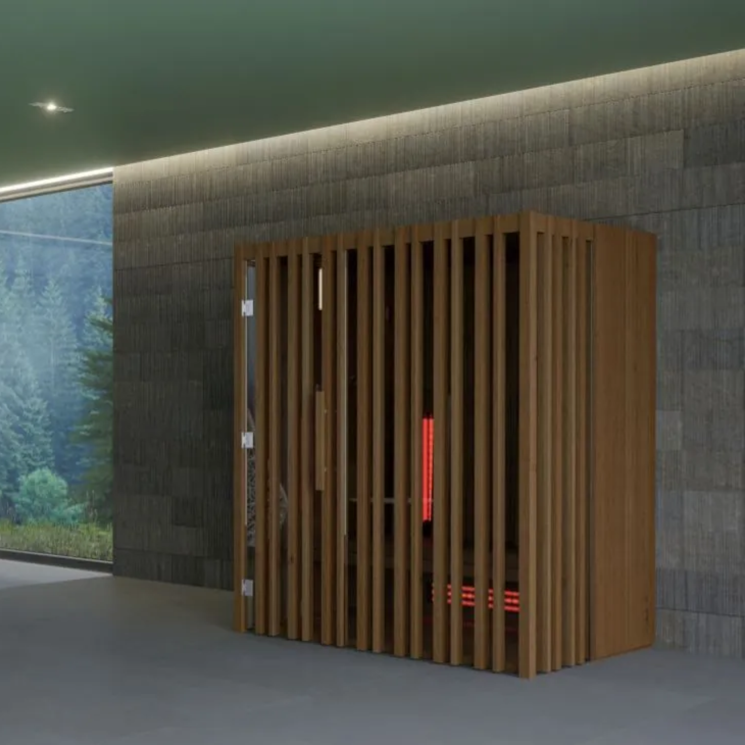 The Irradia blends bold infrared technology with contemporary design. A semi-transparent wood-and-glass frontage, crafted with architect Luca Donazzolo, creates a striking balance of light, warmth, and style.