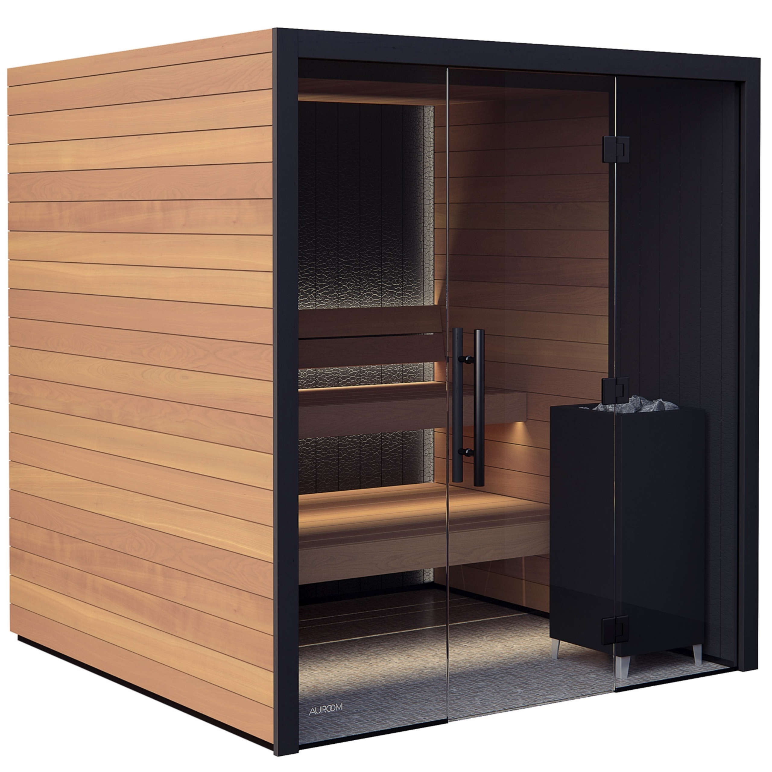 Unwind in style with Vulcana, where golden thermo-aspen walls meet dark Ignite cladding for a striking, modern look. An app-controlled heater, angled backrest, and wide glass frontage combine comfort, ease, and light to create a bright, restorative sauna experience.