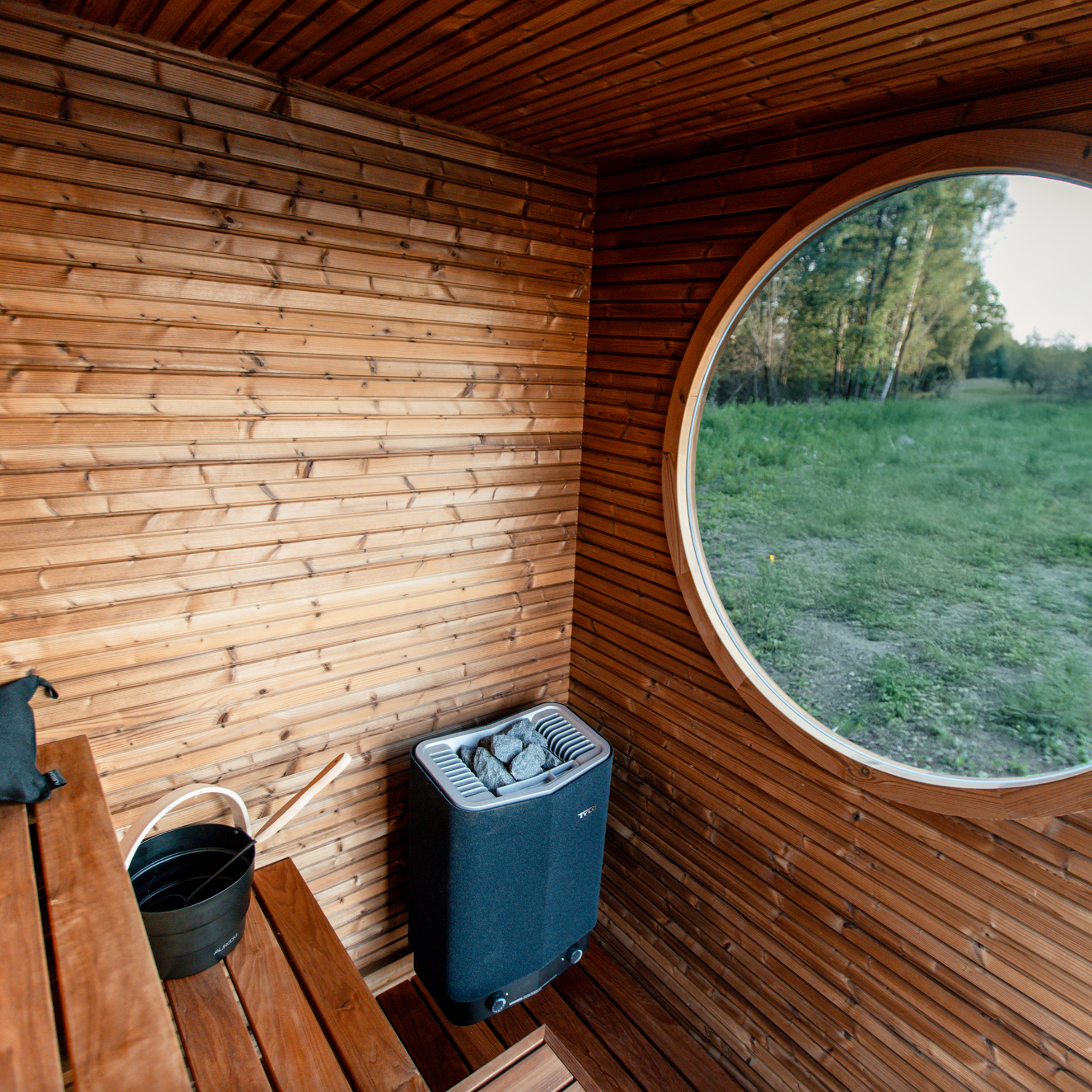 Discover the charm of the Sola barrel sauna, where modern design meets serene comfort. Crafted from high-quality thermally modified spruce, this outdoor sauna stands out with its robust construction and elegant square shape.